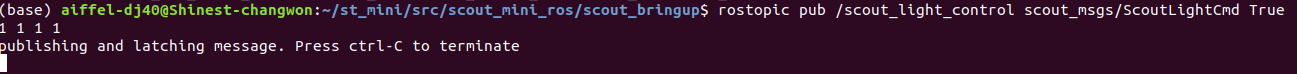 $ rostopic pub /scout_light_control scout_msgs/ScoutLightCmd True 1 1 1 1