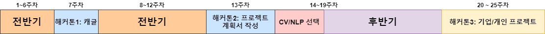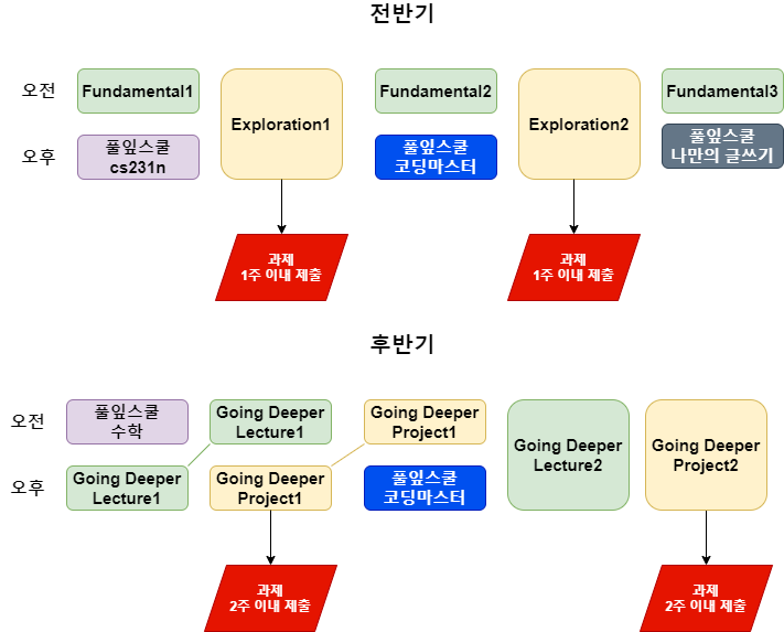 기간으로는 전반기와 하반기로 나눌 수 있으며 가장 큰 변화는 전반기 종료 후에 CV/NLP 중 하나를 선택해 진행한다는 점이다.