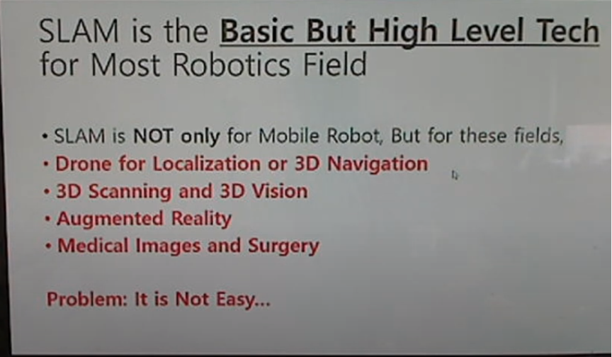 (교수님의 SLAM에 대한 깨알 의견) SLAM 어렵기 때문에 강의를 다 들어도 구현은 힘들겠지만 기초적인 내용과 확률적인 사고 그리고 오픈소스를 다룰 수 있는 수준까지 갈 수 있다.