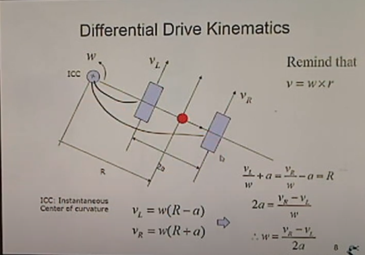 2) v_L = -v_R이면 왼쪽바퀴는 앞으로 오른쪽바퀴는 뒤로 가는 사례. v=0(제자리 회전)
