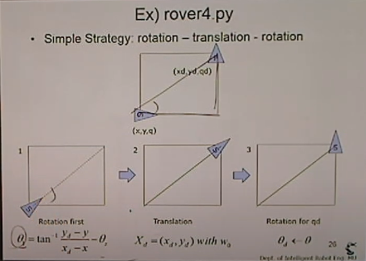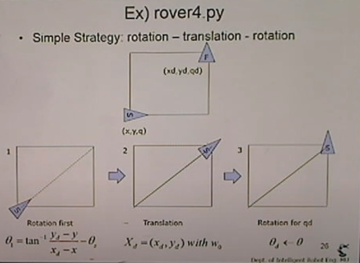 2. 이 강의에서는 간단한 방법인 Rotation, Translation을 순차적으로 해서 모바일 로봇 이동을 보여준다.