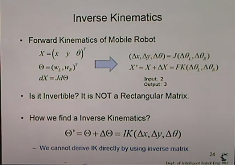 이전 강의에서 입력 2개(바퀴의 각속도)를 이용해 출력 3개(x,y,θ)를 구할 수 있다.