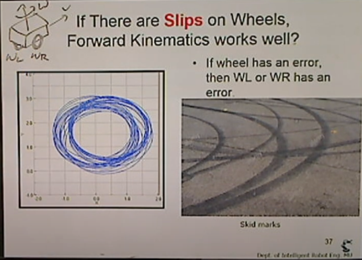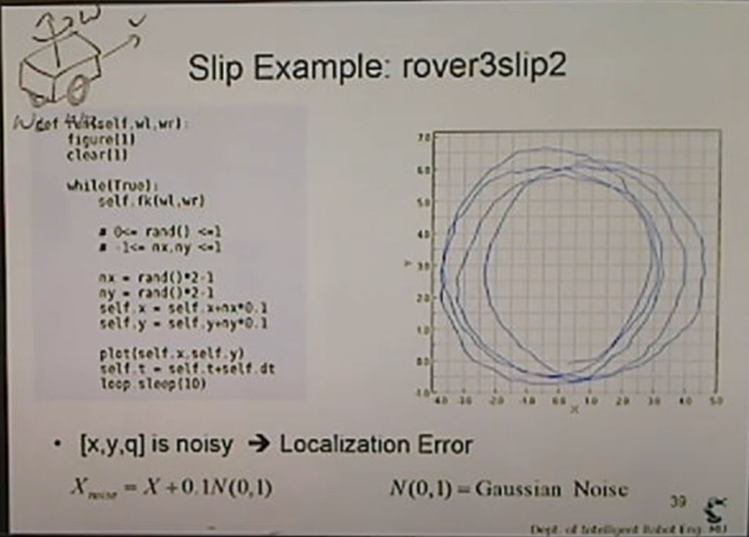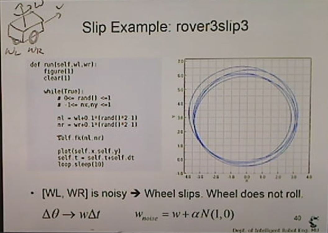자동차의 스키드 마크처럼 모바일 로봇도 Slip현상이 일어난다. 특히 모바일 로봇의 경우에는 무조건 발생한다고 봐야 한다. 이 문제를 대할 때는 바퀴(각속도)가 error를 가지고 있다고 가정하기 때문에 적당한 노이즈가 필요하다.