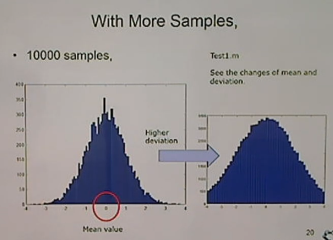 샘플의 개수가 늘어날수록 0 주변에 많이 몰려 있게 된다. (좌측 그래프)