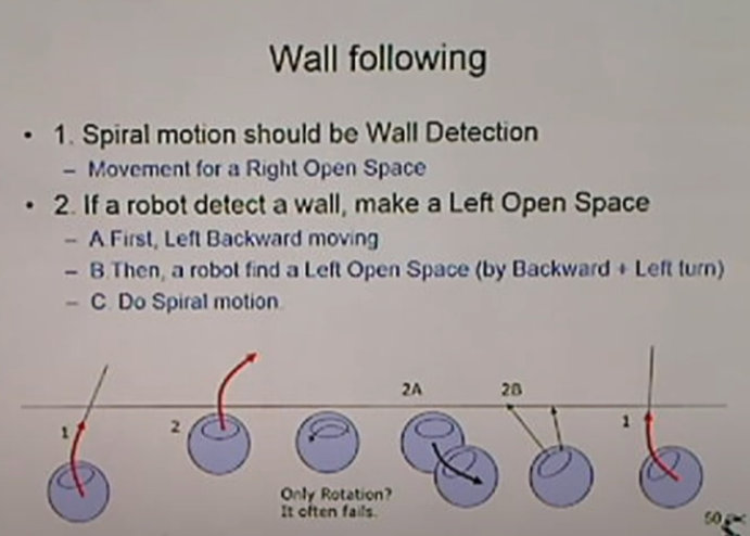 > 기본적으로 우측으로 회전하면서 스파이럴 무브하는데 벽과 가까우면 후진-전진(우회전), 너무 멀어지면 전진(우회전). 이 두가지를 반복