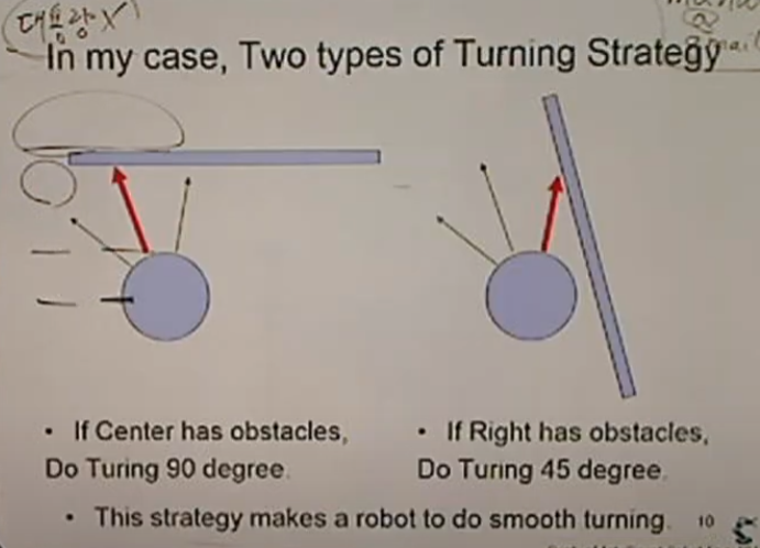 전방 센서로 충돌한다면 왼쪽으로 90도 회전하는 전략 사용.