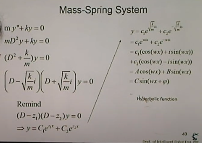 > 2차 시스템. x를 2번 미분했으니 가속도. 움직이면 댐퍼나 스프링이 못 가게 움직인다. 파형은 흔들린다. F는 외력. 외력을 주게 되면 어떻게 움직이는지 보는 식