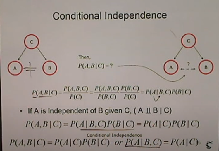 - C 하나가 A,B에 영향을 줄 때, P(A,B|C): C가 주어졌을 때 A,B의 교집합 조건부 확률.