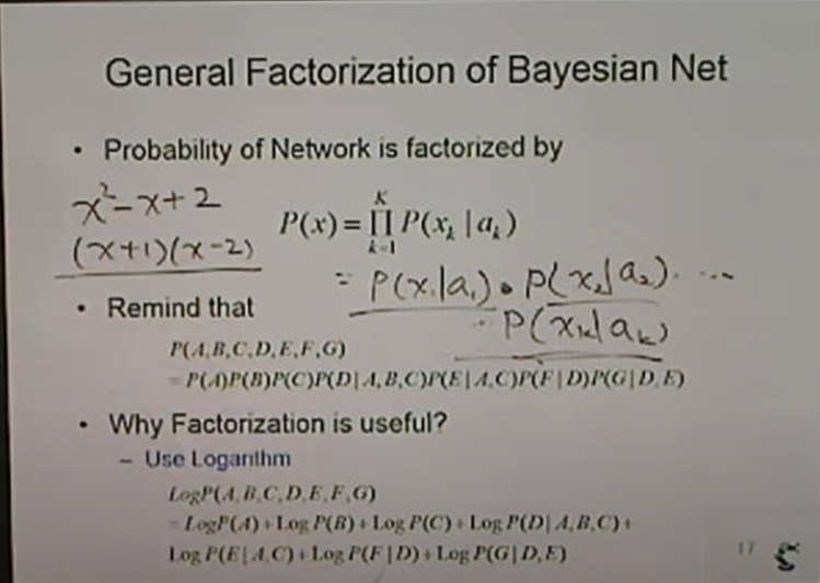 P(F,D,E)=P(F|D,E)P(D,E)=P(F|D)P(D,E): F는 D하고만 연관이므로 E 삭제됨.