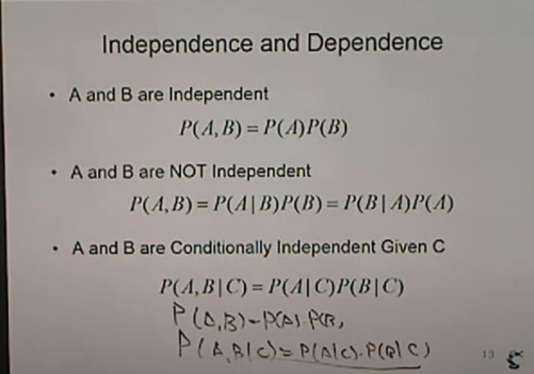 >> P(A|B,C): B와 C의 교집합이 주어졌을 때 A의 확률인데 A,B는 독립이므로 B는 굳이 필요 없다. 즉, P(A|C)가 된다. (또한 P(A,B|C)로도 표현 가능)