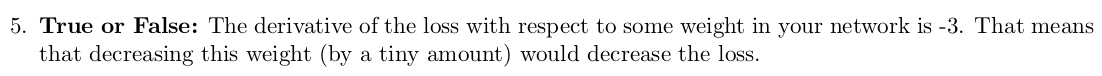 5. 당신의 네트워크에서 몇 가중치의 손실 미분이 -3이라면 이것이 뜻하는 것은 가중치 감소가 손실 감소를 한다는 것이다.
