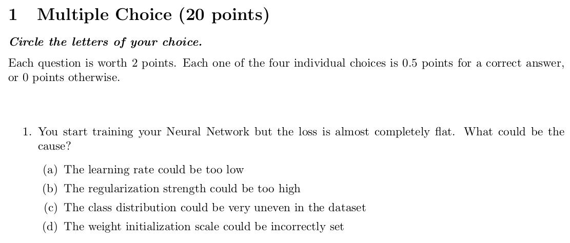 1. 당신은 신경망 학습을 시작했는데 loss가 거의 flat하다. 그 이유는 무엇일까?