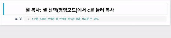 - 셀 복사 & 붙여넣기: 명령모드로 진입해 c를 누르면 해당 셀이 복사된다. v를 누르면 새로 선택한 셀 아래에 붙여넣기가 된다.