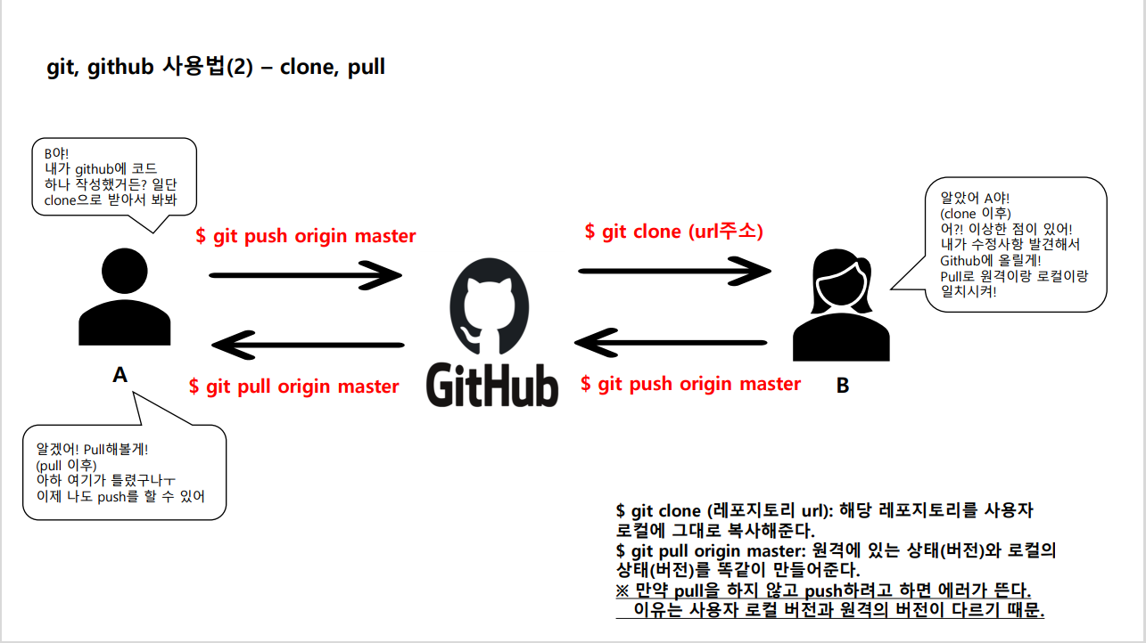 ★ 위의 예시를 보자. A가 먼저 push를 통해 github에 코드를 업로드했다. B는 아직 아무것도 없는 상태이다. B는 clone을 통해 A가 올린 코드 파일을 손쉽게 로컬에 받을 수 있다. (물론 zip파일로 다운도 가능하지만 clone이 훨씬 편하다.)