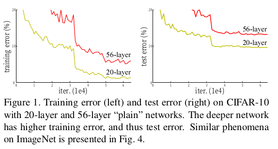 *degradation: 레이어가 깊은 모델이 오히려 얕은 모델보다 성능이 좋지 않는 현상. 최적화가 되지 않았을 때 발생