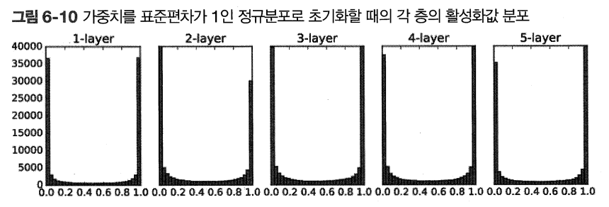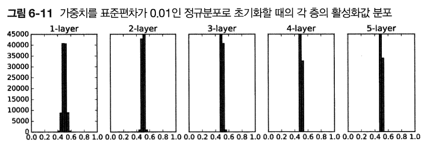 >> 표준편차 = 0.01인 정규분포: 각 층의 활성화 값이 매우 작다 --> 역전파 때 가중치 기울기가 작다 --> 학습이 거의 되지 않는다.