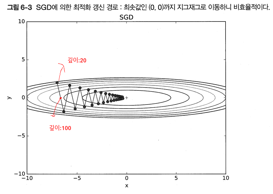 > 기울어진 방향이 본래의 최소값과 다른 방향을 가리키고 있기 때문