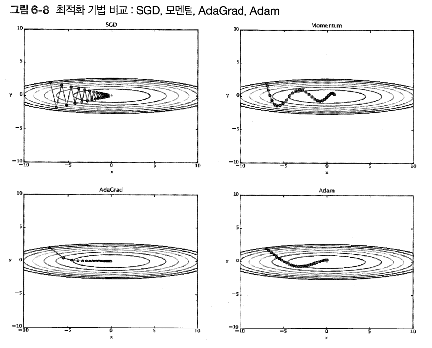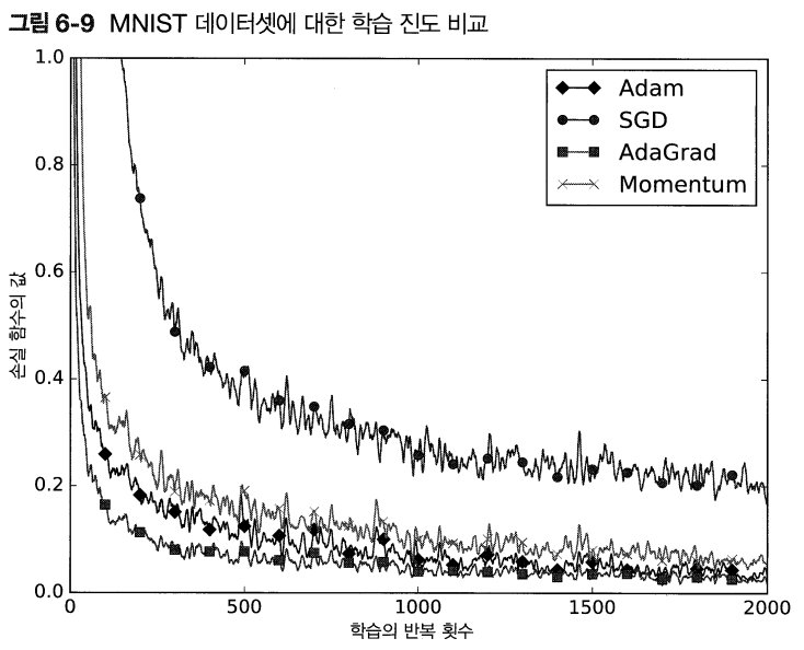 >>> 일반적으로 SGD보다 다른 세 기법이 빠르게 학습하고, 때로는 최종 정확도도 높게 나타남.