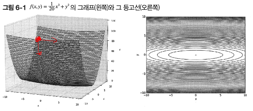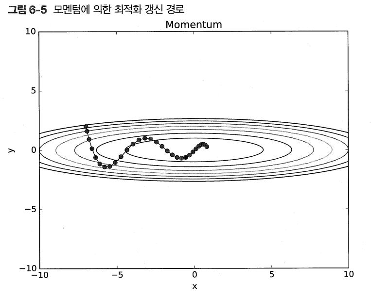 > 모멘텀을 이용하면 SGD보다 x축으로 더 짧은 step을 이용해 이동