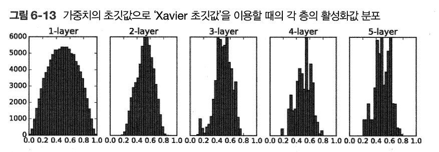 >> Xavier 초기값: 층이 깊어지면서 치우침이 커짐 --> 기울시 소실 문제 발생