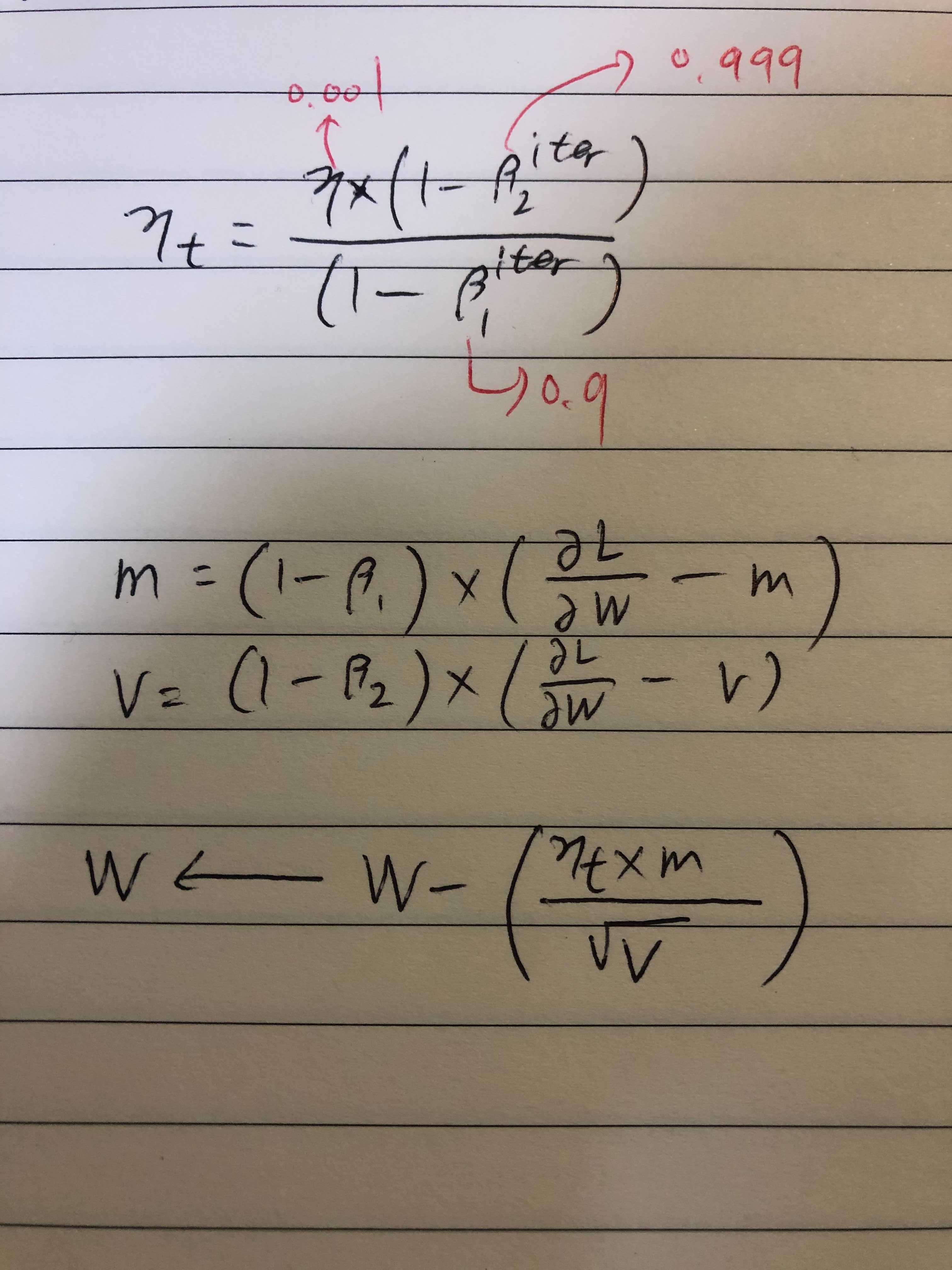 위 코드를 토대로 수식을 작성...했는데 틀릴 수도 있으니 arxiv.org/pdf/1412.6980.pdf 논문에서 확인해보자