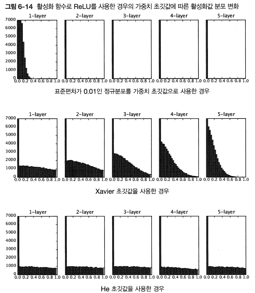 >> He 초기값: 모든 층에서 균일하게 분포 --> 역전파 때도 적절한 값이 나옴
