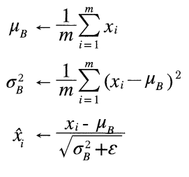 위 식은 단순히 미니배치 입력 데이터 {x1, x2, ..., xm}을 평균0, 분산1인 데이터로 변환.