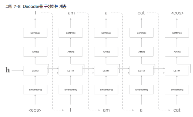 LSTM 계층의 마지막 은닉 상태에 대한 기울기가 dh 인수로 전해짐. (Decoder가 전해주는 기울기)