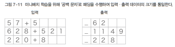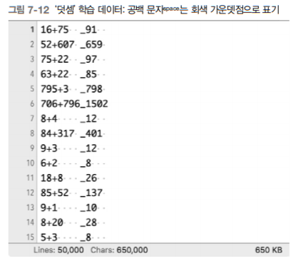 *vocab_size: 어휘수 (문장의 종류) (책에서는 0~9의 숫자와 '+', ''(공백), '_'을 합쳐 총 13가지 문자 사용)