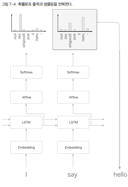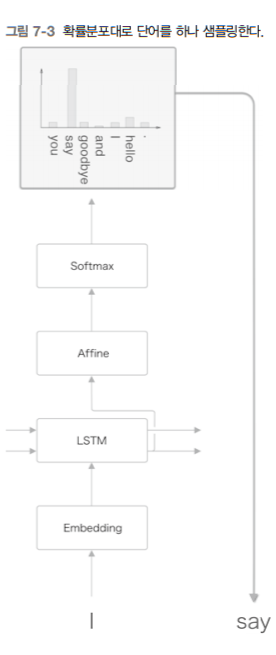 >> 전체 확률분포를 이용해 샘플링한다. (물론 "say"의 확률이 가장 높으므로 "say"가 나올 확률이 높지만 다른 단어도샘플링될 수 있다!)