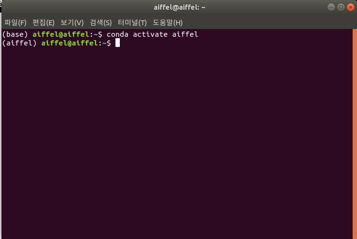아래 처럼 맨 앞의 (base)가 (aiffel)로 바뀐 것을 확인할 수 있다.