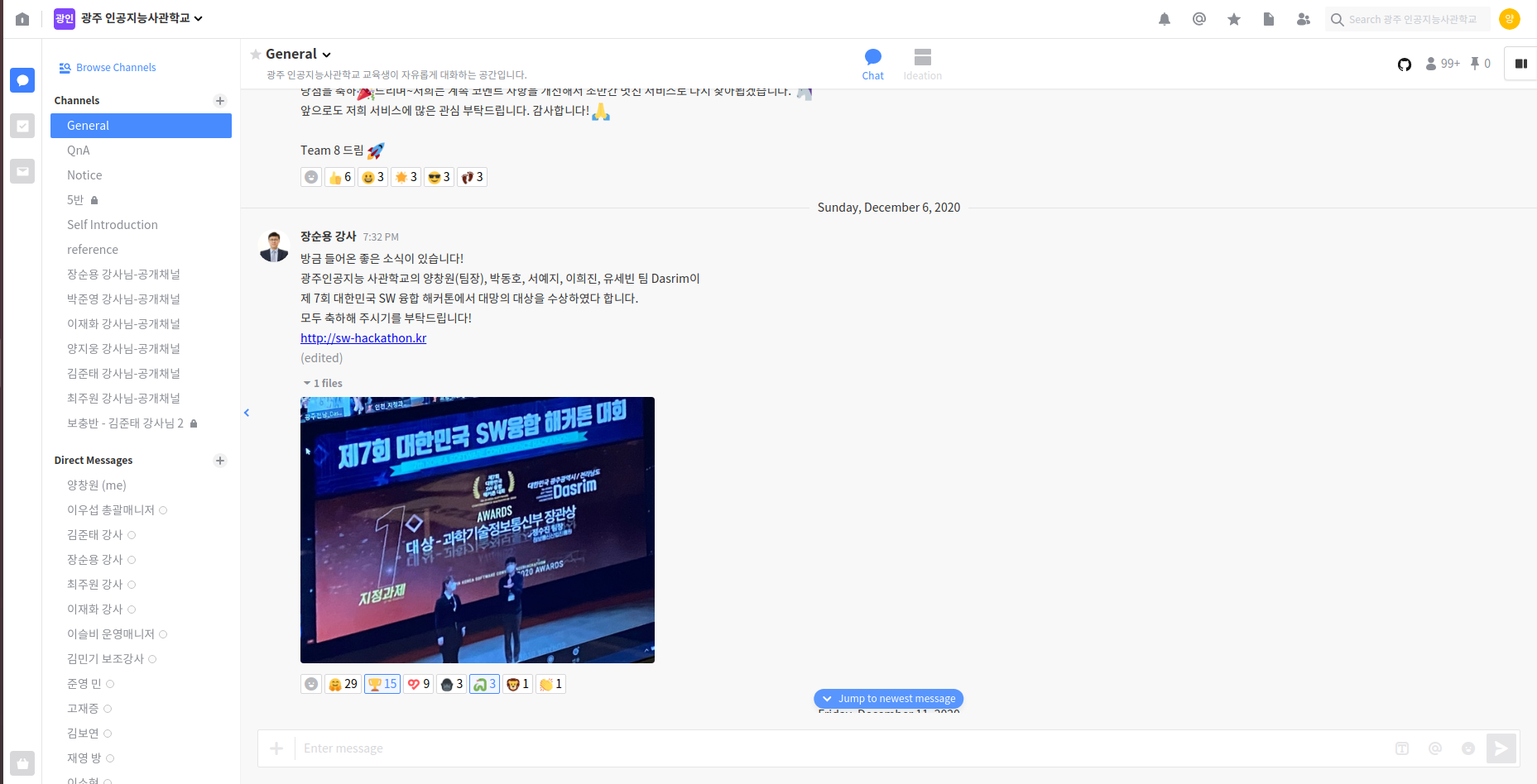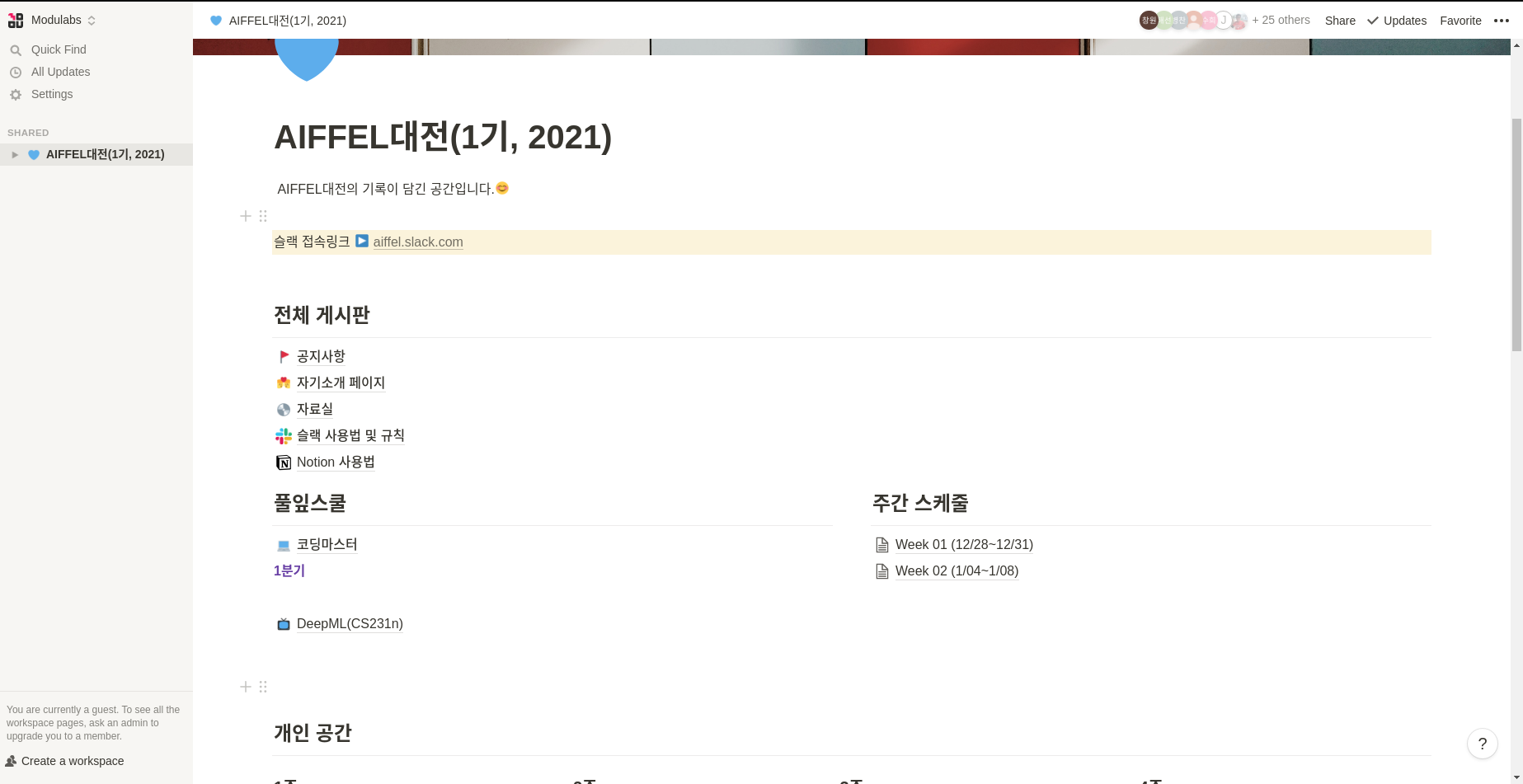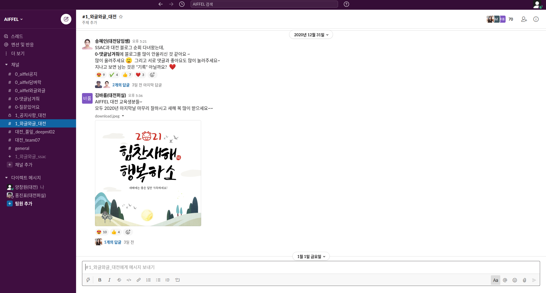 위 그림은 AIFFEL(대전) + AIFFEL(SAAC) 사용하는 slack 화면이다.