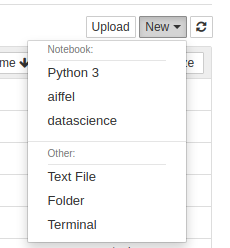 우측 상단에 New를 클릭하면 Python3, aiffel, datascience 등이 보인다. 이는 conda에 설치된 가상환경 이름이다.