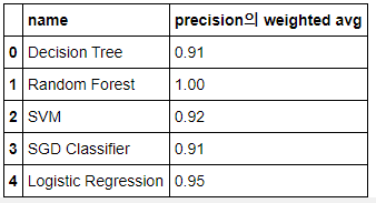 이진 분류(2개)이며 분류한 데이터에 대해 실제 데이터와 얼마나 일치하는지가 중요하므로 precision의 weighted avg로 평가
