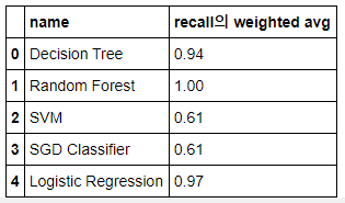 >> Random Forest가 1.00으로 가장 높다. 이진 분류이기에 랜덤 포레스트 혹은 선형회귀가 가장 높을 것이라 예상했는데 예상대로 1,2위를 차지했다.