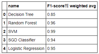 >> SVM과 SGD Classifier은 0.61로 낮다. 적은 클래스라 SVM의 고차원 변환이 역효과를 낸 것 같고 SGD는 정확한 이유는 모르겠다.