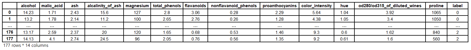 와인 데이터를 데이터 프레임으로 표현해보면 아래와 같다. (label은 target 키를 이용해 추가해줬다)