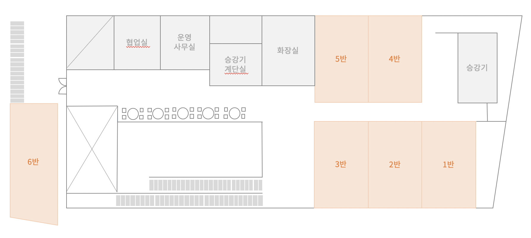 위의 그림을 보면 전체 구조를 알 수 있다. (참고! 다만 3번 좌측에 프로젝트 룸이 2개 있는데 누락되어 있다.)