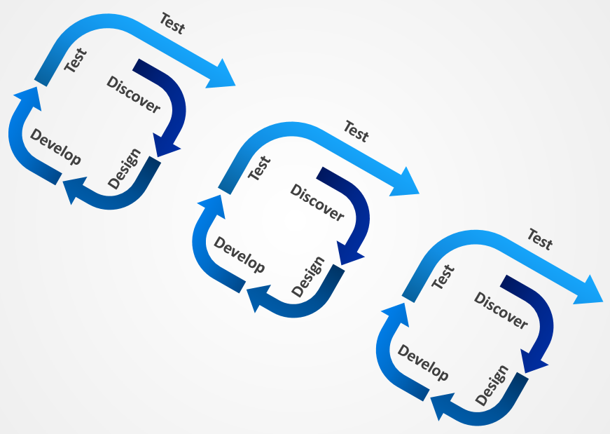 위 그림과 같이 Agile방식은 전체 프로젝트에 대한 일정이 아닌 개발자의 입장에서 볼 때 필요한 모듈 위주로 문제를 정의하고 빠른 일정으로 소규모 단위의 업무를 달성해낸다는 것이다. 이러한 방식은 변수에 유연하게 대처할 수 있다.