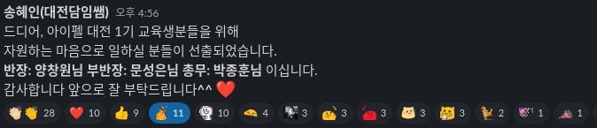 현재 함께하고 있는 모두와 유기적으로 소통하고 운영진 <->교육생의 양방향 소통이 될 수 있도록 노력해야겠다.